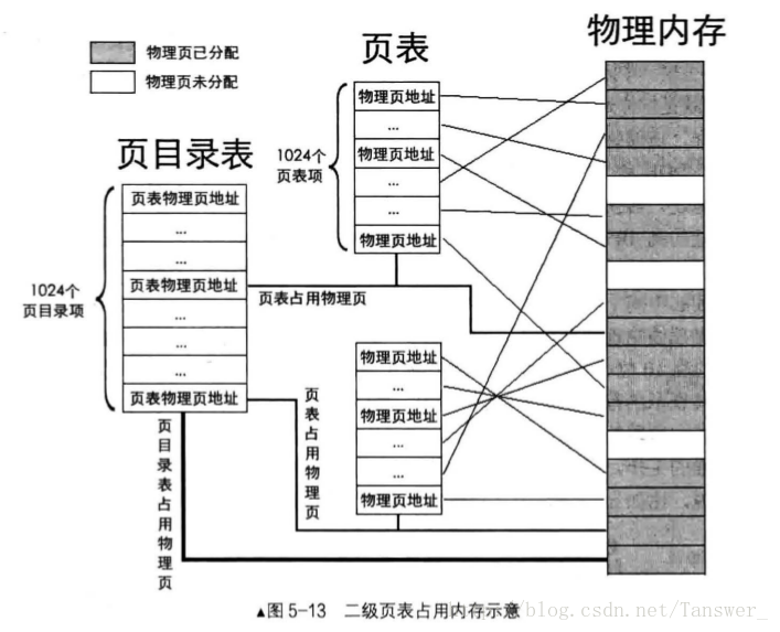 第二级称为页表,由线性地址的11-20位索引,页表中的每一项称为物理页地址,可以索引1024个物理页地址,根据索引从选定的页表中,选取物理页.每个物理页地址为4字节,一个页表为4KB.
